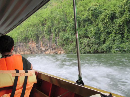 Unterhalb des Resotel warten wir ein paar Minuten bis unser Guide Jokee ein Boot heranpfeift. Wir steigen ein Schwimmwesten an und los geht die kühle, stritzige Fahrt zurück an unser Hotel.
