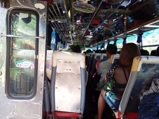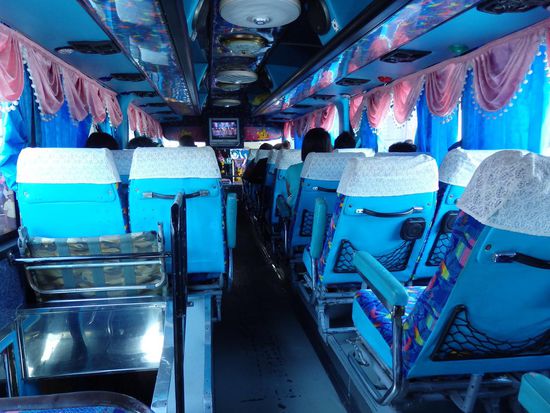 Klimatisiert, großer Bus, richtig angenehm. Gewöhnungsbedürftig ist, dass alles richtig bunt ist, alles blau und rosa mit Winnie Phu Bildern, vorne hängt ein Fernseher, und aus den Boxen dröhnt laut die Musik zu den Thai Musik Videos. Egal, für 70 Bt pro Person ein gutes Reisemittel.