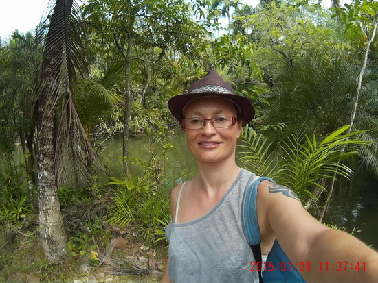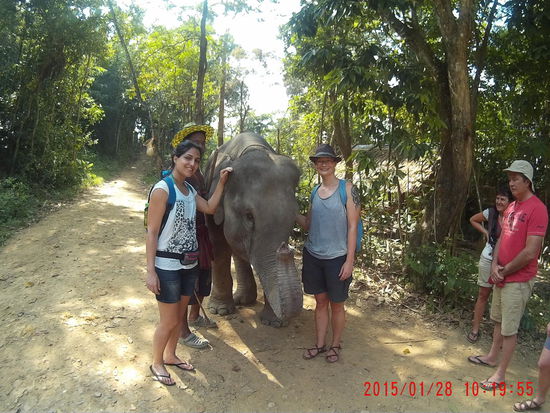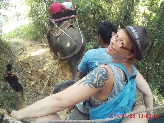 Der Elefant und der Führer ertragen alles geduldig. Meine Ausbrüche, wenn ich wieder ein ekliges Riesengetier enteckt habe oder unser im Duett vorgebrachtes Geschrei "ich bin ein Star, holt mich hier raus ". Schließlich sehen wir das erste Mal andere Touristen auf einem Parallelweg. Eine Spinnen noch und dann stoßen wir auf den Touristenpfad. Dort machen wir einen weiteren Fotostop, bei dem wir auf dem Hals des Elefanten sitzen dürfen und der Guide mit unseren Kameras Fotos und in meinem Fall ein Video macht. Dann schließen wir uns den anderen an.