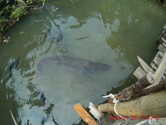 Weiter geht's zur Fischfarm. Die hat schon bessere Tage gesehen. Gleich am ersten Becken wieder eine Riesenspider. Die Krokodile beeindruckend uns nicht, aber der sicher drei Meter lange Riesenfisch ist echt sehenswert. Mit dem möchte ich nicht schwimmen.