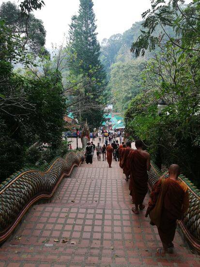Auch wenn die Stadt selbst genügend Attraktionen für einen weiteren Tag Herumstromern geboten hätte, liehen wir uns am zweiten Tag zwei Roller und brachen auf einen kleinen Motorrad-Loop im Westen auf... und fuhren direkt in eine Polizeikontrolle. "International driver's license, please." Haben wir nicht. Das macht 15€ pro Person. Na klasse. Die Tatsache, dass wir nach Entrichtung der Strafe eine Quittung erhielten, mit der wir für drei Tage weiterfahren durften, war zwar aus unserer Sicht erfreulich, beweist aber auch, dass es den Behörden hier nicht darum geht, potentiellen unfähige Verkehrsteilnehmer aus dem Verkehr zu ziehen, sondern einfach gesagt legal abzucashen. Aber was soll man machen? Wir fuhren also zu einem Tempel namens Doi Suthep, von dem man einen wunderbaren Blick über die Stadt und das Umland haben sollte. Leider war es an dem Tag ziemlich verhangen, also schauten wir uns nur kurz in der von Gold nur so glänzenden Anlage um und fuhren weiter. Der Loop führte uns rund 100km durch das Bergland. Auf gewundenen Straßen ging es durch tropische Wälder und an Erdbeerhainen vorbei. Die Landschaft hier war wieder völlig anders als in Laos, weniger wild, aber sehr lieblich. Das Rollerfahren machte auf der kurvenreichen Strecke besonders viel Spaß. Um einen schnellen Eindruck von der Landschaft Nordthailands zu erhalten, war der Ausflug perfekt.