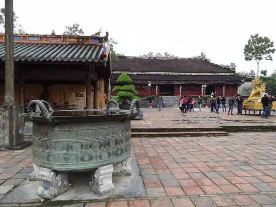 Nachdem wir uns den ersten Tag im leichten Bieranzug im Hotel verschanzt hatten und mit nassen Fuessen aus dem kleinen Fischerdorf wiederkamen, wude das Wetter am naechsten Tag besser , sodass wir uns auf die Socken gemacht haben, um die verbotene Stadt in Hue zu besichtigen. Die verbotene Stadt, ist eine sehr viel kleinere Ausgabe nach dem chinesischen Vorbild in Peking.