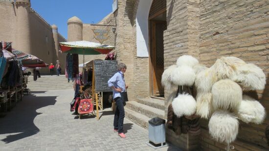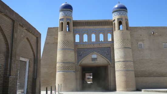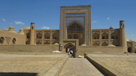 Am nächten Morgen erst mal über diese Klapper-Brücke und dann auf Landstrassen unterschiedlichster Qualität von ‚trotz der vielen Schlaglöcher erkennt man, dass die schon mal geteert war‘ über ‚Spurrillen in Schotter und Lehm, aber wird demnächst geteert‘ bis zu ‚frisch gemacht‘ und daher trotz all den LKW immer noch ‚Kinderpopoglatt‘ geht es weiter nach Urgench wo wir uns auf dem Bazar für die Weiterfahrt stärken. Wir erreichen Khiva, eine der ältesten Handelsstädte an der Silk Road und dringen über das East Gate in den alten Stadtkern vor.