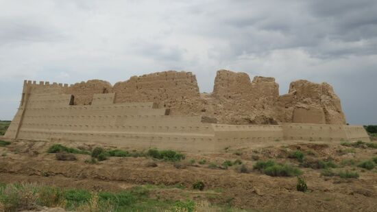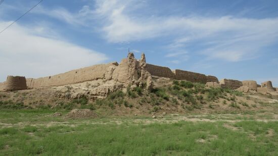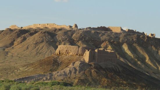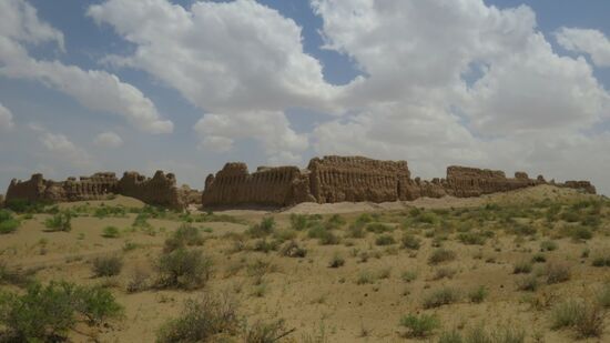 Heute ist unser Kala-Logie Tag, d.h. wir werden eine Teil des Goldenen Ring abfahren und dabei 6 dieser alten aus Adobe erstellten Festungen (Kala) besuchen, die teils schon über 2500 Jahre alt und trotzdem noch recht gut erhalten sind. Nach einer kleinen, für uns unerreichbaren und auch nicht Beschilderten / Dokumentierten Anlage erreichen wir Kyr Kyz Kala, eine riesige Anlage mit einem Touristen-aufnahmebereiten Jurtencamp im Hintergrund.