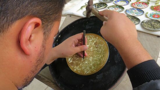 etliche Frauen versuchen offensichtlich maschinenbestickte Tischdecken als ‚Bukhara Handarbeit‘ zu verkaufen und selbst der Pfau schlägt fleissig sein Rad,