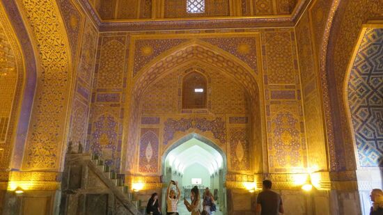 bevor Samarkand und dort den I-Overlander SP ‚mit Aussicht‘ erreichen. Ein Deutscher Feuerwehrmagirus mit H-Nummer steht auch schon da, da kann ja nichts mehr schiefgehen. Wir brechen sofort auf zur Stadtbesichtigung, erreichen auf Hinterwegen und via einem Hintereingang den Registan, werden von der sehr freundlichen Touristenpolizei zur Kasse begleitet (E=Som 40.000) und können dann endlich den Hauptplatz bewundern, der von 3 Medressen umrahmt wird. In der Mitte die Tilla-Kari (Gold Covered) Medresse, fertiggestellt in 1660,