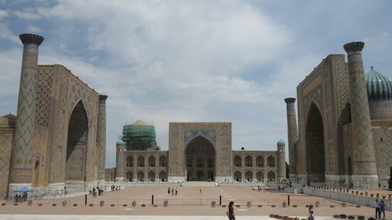 Links wird der Platz von der Ulugbek Medresse, fertiggestellt in 1420, verziert,