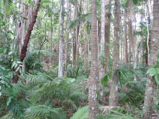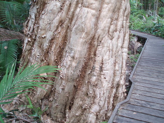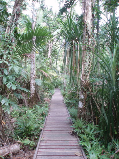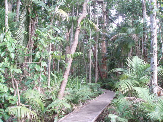 Gegenüber den Flecker Botanic Gardens befand sich der Rainforest Boardwalk, der zu zwei Seen führte. Hier war es um einiges wilder als im botanischen Garten. Der Bretterweg führte mitten durch den Urwald, vorbei an riesigen Bäumen, üppigen Büschen, vermodernden Sträuchern und allem erdenklichen Grün, dass man sich vorstellen kann. Dann und wann ließen sich große Bush Turkeys (wilde Truthähne) beobachten.