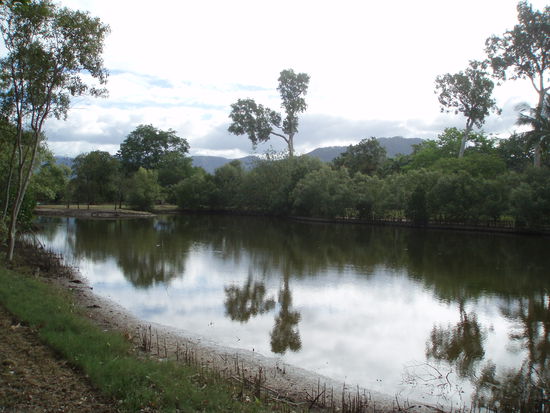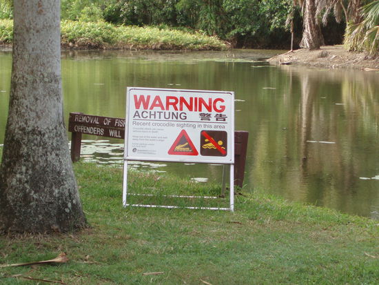 Der Boardwalk führte schließlich in einen kleinen Park, von dem aus es zu den beiden Seen, den Centenary Lakes, ging. Das blaue Wasser, der Wald und die Berge im Hintergrund - diesen Ort kann kein Wässerchen trüben, dachte ich, bis ich das Schild "Vorsicht Krokodile" entdeckte!