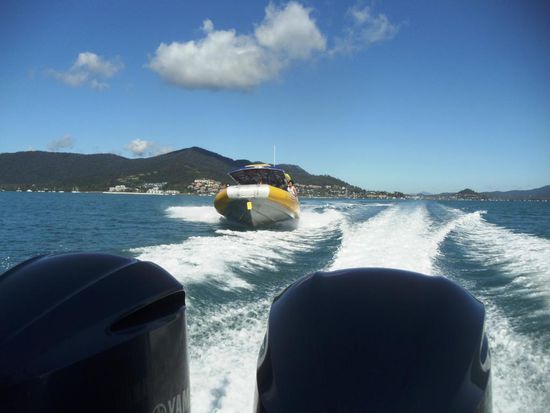 Unser sehr gutes Mittagessen nehmen wir auf einer Sandbank mitten in diesem Paradies ein. Eine Stunde haben wir danach noch Zeit und baden, liegen in der Sonne oder geniessen einfach diesen unvergesslichen Anblick. Auf der Fahrt zurück wird uns nochmals gezeigt, wieso diese Firma Ocean Rafting heisst. Alle vier Schnellboote rasen zusammen über das Meer. Jeder Fahrer versucht, wenn irgendwie möglich, über die Wellen des vorausfahrenden Bootes zu springen. Das Tempo ist atemberaubend, der Spass und Nervenkitzel ist garantiert. Alle vier Boote treffen zusammen im Hafen ein, jeder rast auf die Hafenmauer zu und reisst im letzten Moment das Steuer herum. Rafting auf dem Ocean. Ein Erlebnis, aber sicher nicht ganz ungefährlich und ich denke, in Europa nicht möglich oder einfach nicht erlaubt.