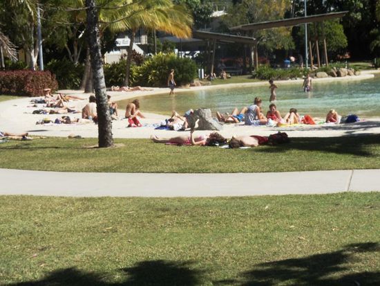 Die Jungs aus Deutschland und wir Zwei beschliessen, einen Tag länger in Airlie Beach zu bleiben. Den Tag verbringen wir an der Lagune am Meer. Diese künstlich angelegte Lagune verfügt über Liegewiesen, Sandstrand und Pools, welche zum Baden einladen. Das Baden im Meer hier ist sehr gefährlich, weil es von giftigen Quallen nur so wimmelt. Am Abend gehen die Jungs und Patric noch einmal in den Ausgang. Ich habe wieder einmal ein wenig Heimweh, verkrieche mich im Zelt und lese noch ein wenig.