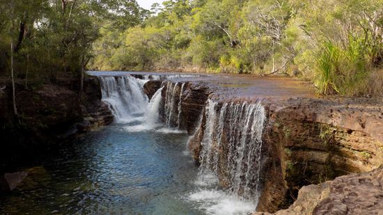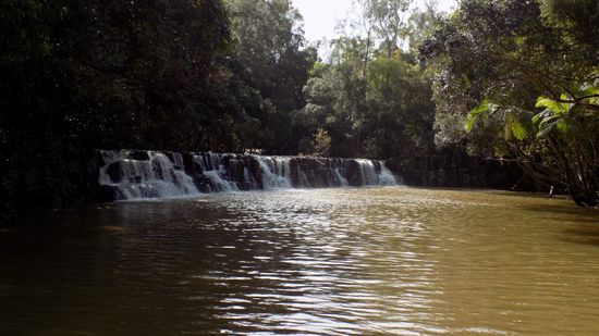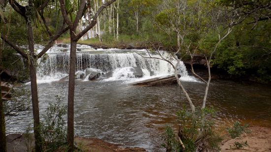 wie man mit einem riesigen Segelschiff jemals aus diesem Gewirr von Korallenriffen und Sandbänken jemals wieder heraus kommen soll. Weiter geht es Richtung Nord-Westen auf guter neuer Asphaltstrasse, vorbei an den Endeavour Falls;