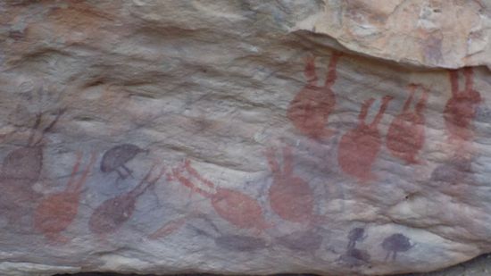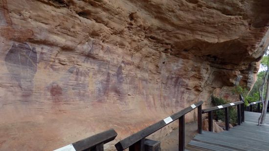 Laut unserem Führer gibt es ca. 30km südlich von hier die Split Rock Gallery, bis zu 14.000 Jahre alte Felszeichnungen der Ureinwohner Australiens. Da fahren wir noch schnell mal hin, steigen gut 100m den Berg hoch um dann an einem Überhang solche Felszeichnungen zu sehen. Manche sehr gut zu erkennen,