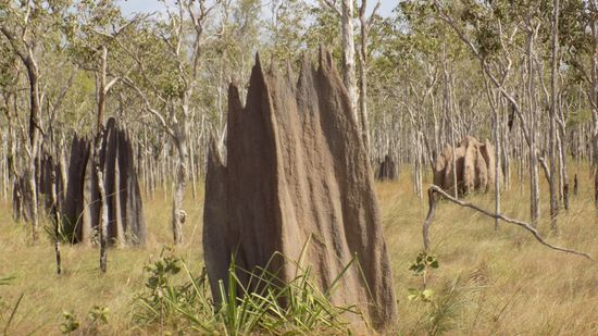 wo Termitenhügel die sonst schattenspendenden Bäume ersetzen müssen. Am Musgrave Roadhouse,