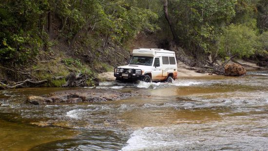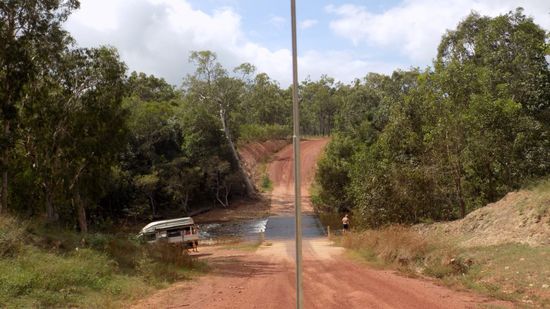 Wir schauen neidisch zu, wie andere diese Crossing bewältigen und fahren dann weiter zum Cockatoo Creek, ein felsiges Flussbett mit tiefen Auswaschungen, Schlaglöchern. Keiner ist da um uns den Weg zu zeigen, gehen wir halt selber ins Wasser, suchen uns den Untiefen freisten Weg