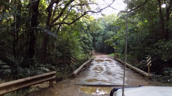 die wir auf der anderen (rechten) Seite mit jeweils ½ Reifen in der Luft überqueren. Nach den Fruit Bat Falls mit ihrem Swimming Hole (Badebecken), einer der wenigen Sehenswürdigkeiten hier in der Gegend,