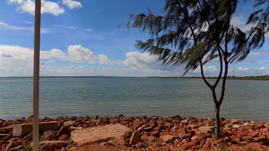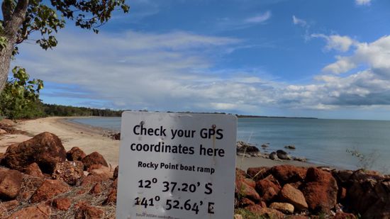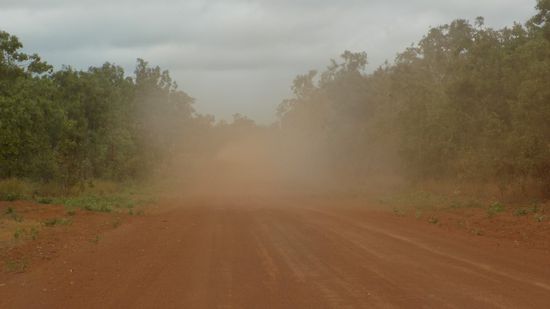 dann hilft nur noch bremsen, stehenbleiben und warten bis sich der Staub wieder etwas gelegt hat. Weipa selbst ein kleines Städtchen am Westufer der Halbinsel, mitten im größten Bauxitabbaugebiet der Welt gelegen, am Nordende der Stadt Rocky Point mit Bootslände