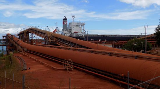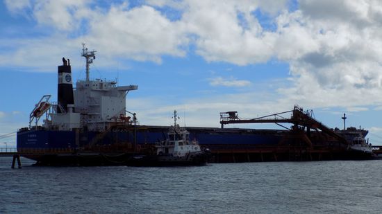an der südlichen Ortszufahrt Evans Landing, der Hafen mit seinen Verladeanlagen,