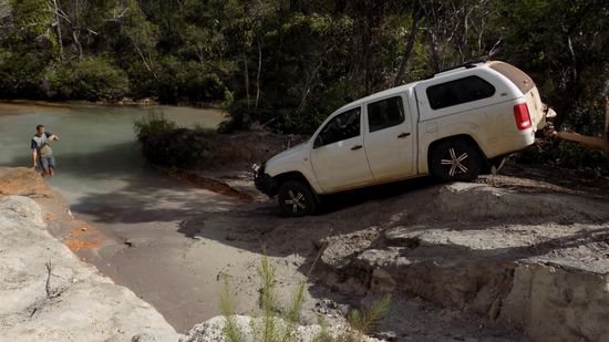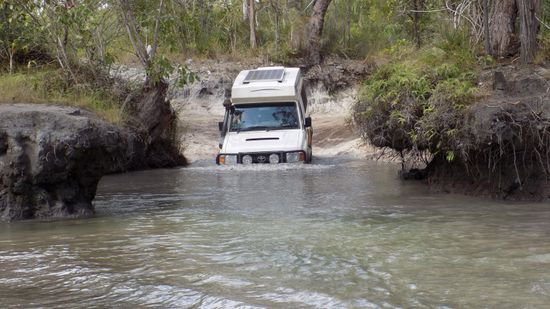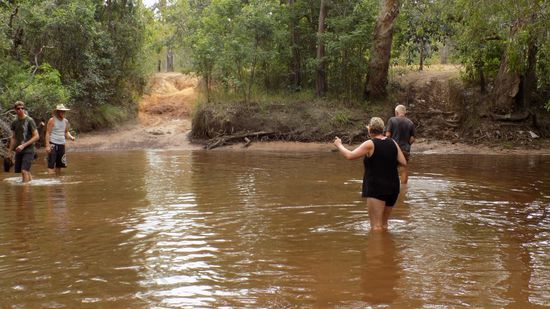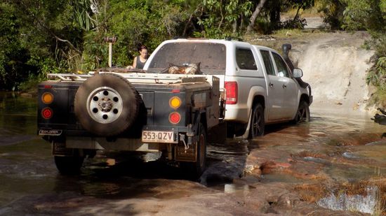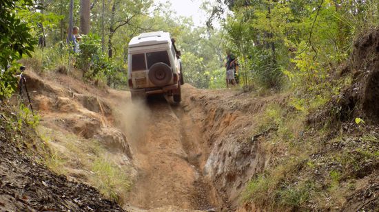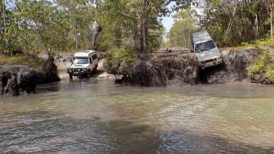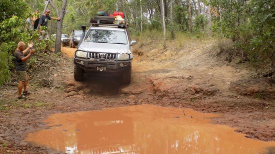 wobei hier mal schön die Wirkung einer Differentialsperre gezeigt werden kann, ein Rad in der Luft und das anders wirbelt kräftig Staub auf, schiebt so das Fahrzeug den Berg hoch. Am Ducie Creek wird gemeinsam die beste Route durch den Fluss gesucht,
