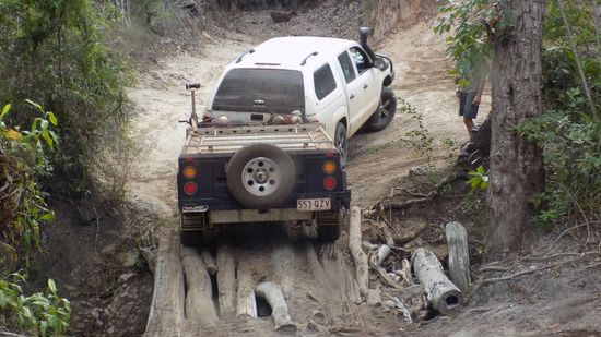 = Ansammlung von über den Bach gelegten Baumstämmen ist nur fahrzeugbreit und bei der Anfahrt sehr schwer einzusehen. Über Stock und Stein geht es munter weiter