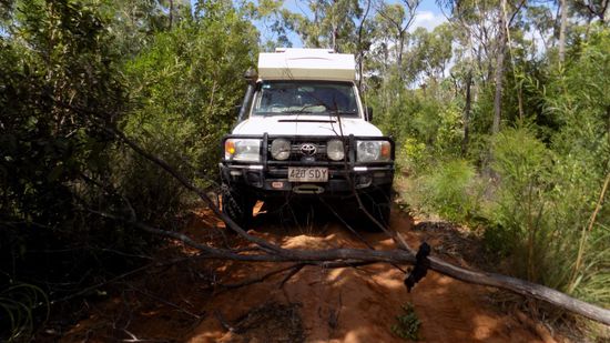 Wie gestern schon wird diese Wassermenge spielend geschafft, auch der 6. Fluss für heute erfolgreich überquert. Wir fahren weiter geradeaus, stossen unterwegs diesen Baumstamm, der uns den Weg versperren möchte, dabei aber nicht mit unserer Seilwinde gerechnet hat,