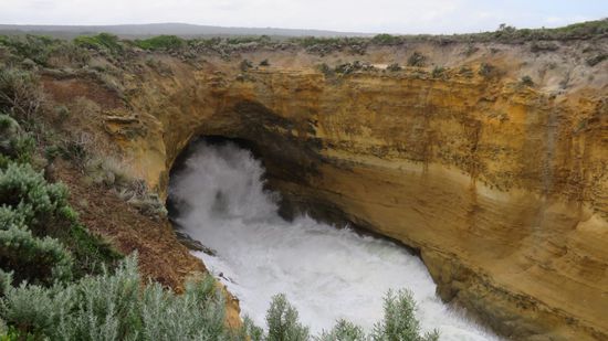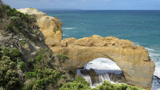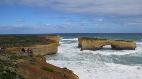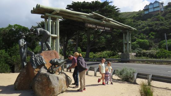 kommen am Great Ocean Road Memorial Arch vorbei, der an den Bau dieser Strasse im Rahmen eines Kriegsheimkehrerbeschäftigungsprogrammes erinnern soll,