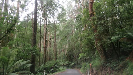 fahren dann mitten durch den sogenannten ‘Cold Rainforest’, am Wegesrand Eukalyptus Bäume und Baum-Farne in allen Variationen.