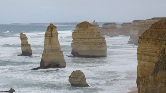 steigen wieder hoch und fahren weiter zum 12 Apostel Lookout, sehen auch mal 6 dieser Apostel Felsen auf einmal, aber irgendwie schaffen wir es nicht alle 8 der noch stehenden Felsen gleichzeitig zu sehen, identifizieren zu können.