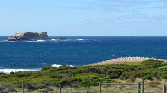 und sehen dort am Wegesrand einen Wegweiser zur Gannet Kolonie, dem einzigen Platz auf dem Australischen Festland, auf dem diese Vogel brüten.