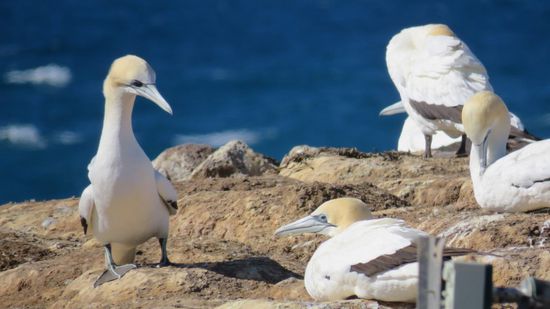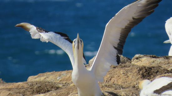 Wir betrachten die Vögel aus der Ferne, wollen schon wieder weiterfahren, da kommt doch einer der Vogelwärter mit einer kleinen Reisegruppe auf den Parkplatz, erlaubt uns, dass wir uns der Gruppe anschliessen und so in den normalerweise abgesperrten Nistbereich dieser Vögel zu gelangen, diese fantastischen Segler wirklich aus nächster Nähe bewundern zu können.