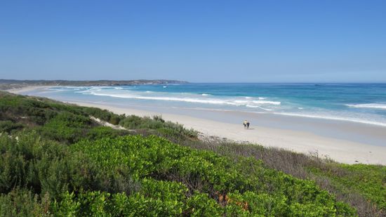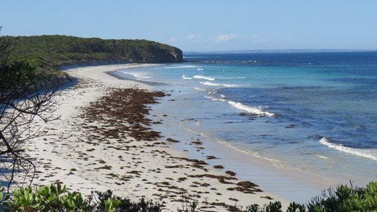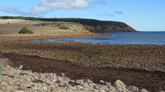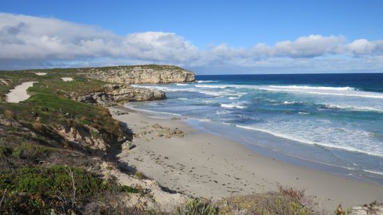 das wir leider nur bei Tageslicht und daher unbeleuchtet gesehen haben. Durch endloses Farmland, der Weg gezäunt von riesigen Herden von Schafen und Rindviechern erreichen wir über Emu Bay mit angeblich 5km langen, seinem irgendwo in den Klippen versteckten, weissen Sandstrand, fahren weiter nach Stokes Bay mit seinem Rock Pool,
