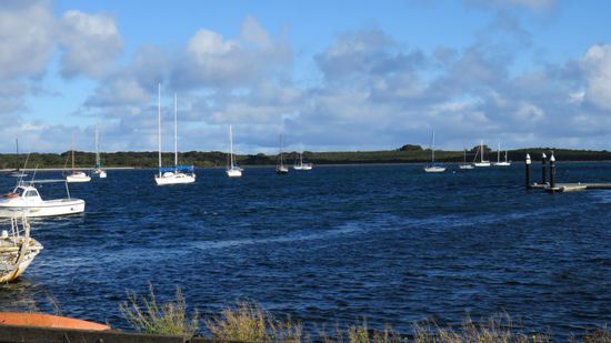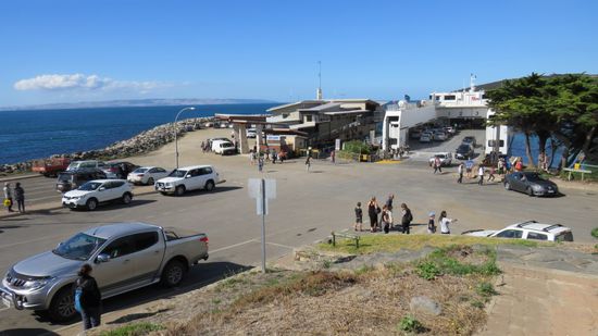 und erreichen dann den Fähranleger in Penneshaw. Entgegen den Aussagen bei der Buchung vor ein paar Tagen ist die angeblich ausgebuchte 14:30 Fähre fast leer,