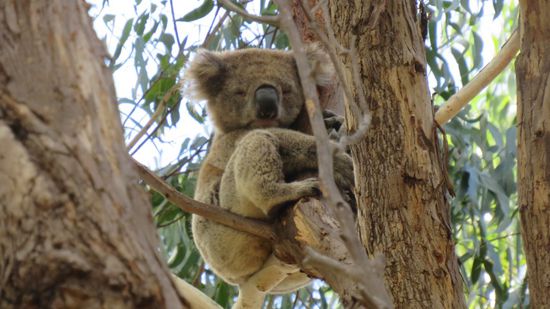 Wir fahren erst Richtung Westen, dann Richtung Süden in den Flinders Chase NP. Im Visitor Center zeigen wir unsere Jahrespässe vor – und bekommen zum Dank dafür einen Tagesausweis für die Frontscheibe am Auto. Obelix lässt grüßen, denn: wir dürfen 1 Jahr lang hier rein, müssen uns halt nur jeden Tag einen neuen Ausweis ausstellen lassen. Dafür erhalten wir aber auch noch den Tipp, dass entlang des Heritage Walks sich zur Zeit Koalas aufhalten würden. Stimmt, nach knapp 100m auf diesem Rundgang sitzt schon der erste droben im Baum