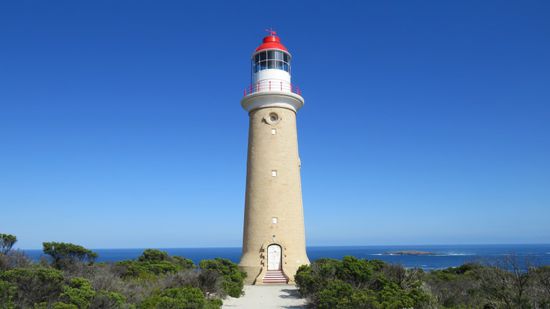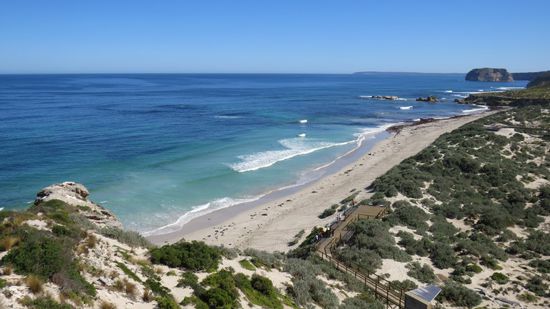 Vom Hafen in Penneshaw, nach Pennington Bay (weisser Sandstrand), American River (blaues Wasser), Kingscote (verschlafene Waterfront), die North Coast Road entlang nach Emu Bay (noch viel mehr weisser Sandstrand), über Stokes Bay und Westen River Cove bis zur Cape Borda Light Station. In den Flinders Chase NP, auf der South Coast Road zu den Kelly Hill Caves, in den Seal Bay Conservation Park, zur D’Estrees Bay und über das Cape Willoughby Lighthouse zurück zur Fähre nach Penneshaw.