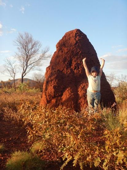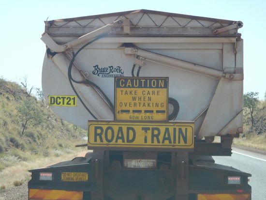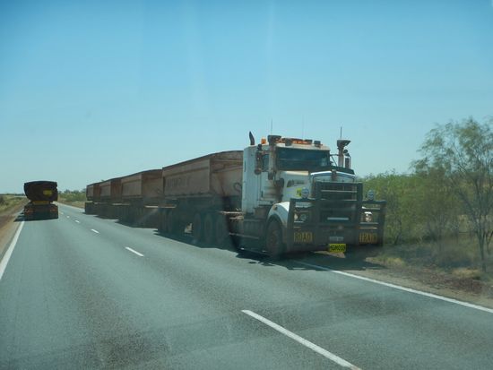 Auf dem Weg sehen wir meterhohe Termitenhügel, karge Landschaften und unglaublich lange Trucks.