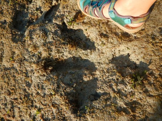 Wir sehen Baobabbäume und versteinerte Dinosaurier-Fussabdrücke. Manche entdeckt man nur mit viel Fantasie, andere sind gut erkennbar.