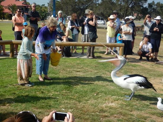 In Kalbarri, das ist hier in WA mit 2000 Einwohnern schon eine grössere Stadt, kann man jeden Morgen Pelikane füttern. Sonja's Fisch wurde leider im Flug von einer Möve geklaut.