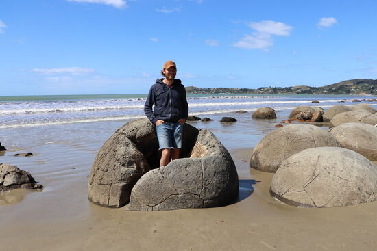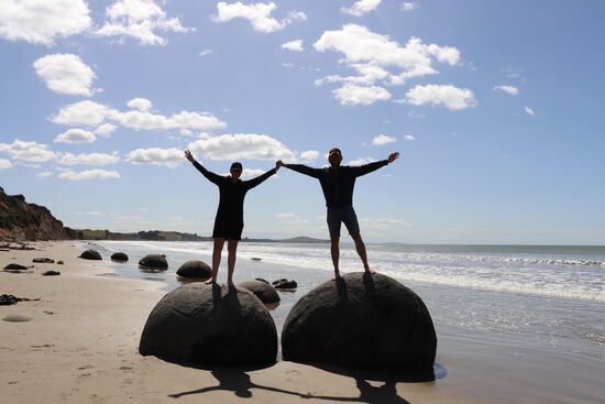 Am nächsten Tag fuhren wir weiter nach Dunedin. Auf dem Weg dorthin streiften wir die Moeraki Boulders - riesige, runde, aus dem Meer ragenden Steine, die laut einer Maorilegende Teile eines uralten Kanu-Wracks sind. Es macht tierisch Spaß, zum Posieren auf den Steinen herumzuklettern. Und nicht umsonst ist dieser Platz ein beliebtes Postkartenmotiv. Da Stefan vor zehn Jahren schon einmal die Südinsel Neuseelands und somit auch Dunedin besuchte, hatte ich mit ihm einen perfekten Stadtführer. Wir klapperten die berühmtesten Sehenswürdigkeiten ab, z. B. den historischen Bahnhof, das Siedlermuseum oder die Baldwin Street, die steilste Wohnstraße der Welt. Es war ein schöner und gemütlicher Tag in der Stadt. Da die Otago Peninsula nur etwa eine halbe Autostunde von Dunedin entfernt liegt, wollten wir uns auch diese nicht entgehen lassen. Eines unserer Highlights auf der Halbinsel war auf jeden Fall der Besuch am Sandfly Bay. Zum Strand gelangt man nur über den Fußweg die steilen Sanddünen hinunter. Das Wasser war strahlend blau, die Dünen perfekt geformt... Unser Höhepunkt waren die Seebären, die sich ganz faul am Strand gesonnt haben! Man hat Gänsehautfeeling, wenn man diesen gewaltigen Tieren so nah ist. Ob das mit dem einzigartigen Moment zu tun hat oder damit, dass diese Tiere unglaublich schnell und wuchtig sind, dessen sind wir uns auch nicht ganz sicher...