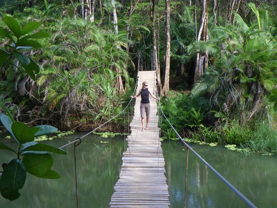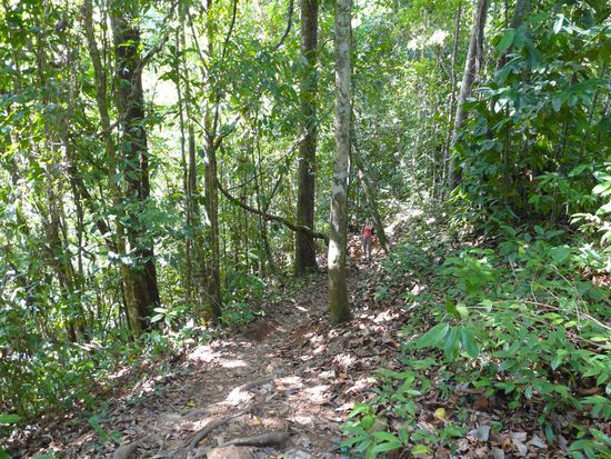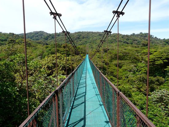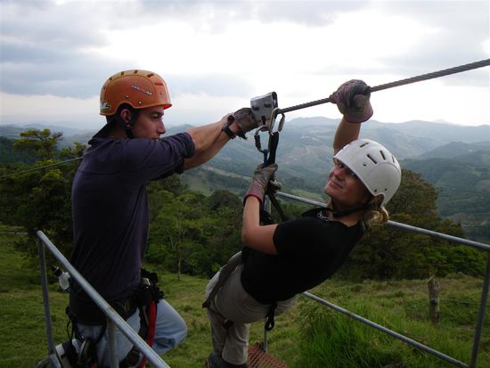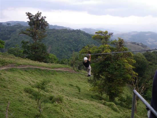 Am naechsten Morgen sind wir durch und auf Haengebruecken ueber den Nebelwald gewandert. Spaeter waren wir noch im Kolibrigarten, wo man 30 verschiedene und freilebende Arten von Kolibris sehen kann. Der Nachmittag wurde zu einem absoluten Highlight unserer Reise. Wir haben den Canopypark von Extremo besucht. Dort gibt es die laengsten (bis 700 m) und hoechsten (bis 150 m) Seile. Man rast mit bis zu 60 km/h durch den Nebelwald und ueber Schluchten. Zu viele Gedanken sollte man sich dabei und auch bei den sogenannten Ueberraschungen nicht machen. Dabei handelte es sich um das Abseilen von einer 30 Meter hohen Plattform und den folgenden Tarzansprung. Erst 20 Meter freier Fall und dann mit vollem Schwung wie Tarzan knapp an den Baeumen vorbei durch den Dschungel schweben. Es war grossartig und wir werden dieses Erlebnis nie vergessen.