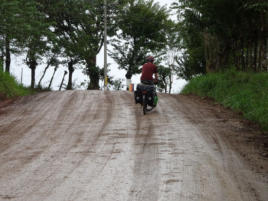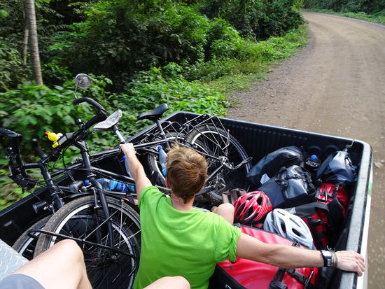 Die ganze Nacht regnet es heftig. Am Morgen turnen die Weißschulterkapuzineraffen tatsächlich nahe des Hauses in den Bäumen herum! Sie sind nicht scheu und wir beobachten sie eine ganze Weile. Derweilen recherchiert Dylan diverse Internetseiten: keine Chance landeinwärts, wir kommen nicht über die Flüsse. Es gibt keine Brücken, aber dafür z.Zt. viele Krokodile. Wir verzichten dankend auf dieses Erlebnis und fahren zurück in die Hafenstadt. Ab dort führt eine ungeteerte Straße in unsere Richtung. An sich kein Problem, nur eben extrem aufgeweicht. Bergauf drehen die Hinterräder trotz des großen Gewichts durch und Schieben ist auch rutschig. Nach 10km "rettet" uns Antonio mit seinem Toyota. Wir laden die Räder auf den Pickup und bringen so die 15km Matsch hinter uns Dann gibt es wieder Asphalt und wir rollen bis Puerto Naranjo. Hier enteckt Thomas eine kleine Sporthalle abseits der Straße. Da wir mit Sportanlagen schon in anderen Ländern gute Erfahrungen gemacht haben, fragen wir. "Klar, kein Problem. Ihr könnt duschen (ein an die Wand geschraubter Wasserschlauch) und dann in der Halle schlafen. Bis 21 Uhr ist allerdings Rollschuhlaufen, so lange müsst ihr warten, oder mitmachen." Erst denken wir es kommt keiner, aber dann drehen auf der Fläche ca. 30 jungen Leuten ihre Runden. Es herrscht eine tolle Stimmung: Anfänger, Könner, Kinder und Erwachsene haben Spaß bei lauter Musik und Diskobeleuchtung. Aber ganz ohne Alkohol, wer Durst hat, geht an den Wasserhahn. Aus den Leitungen kommt übrigens in ganz Costa Rica Trinkwasser.