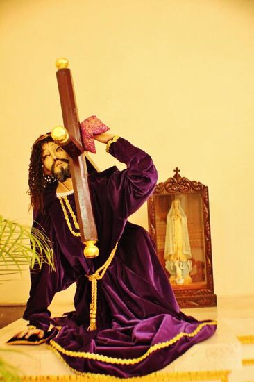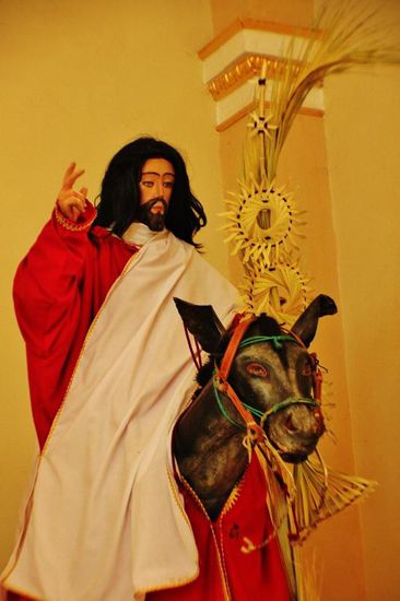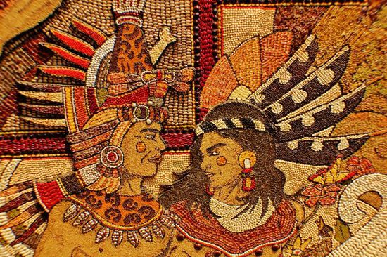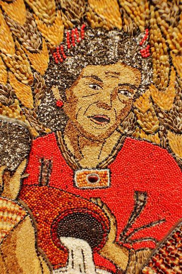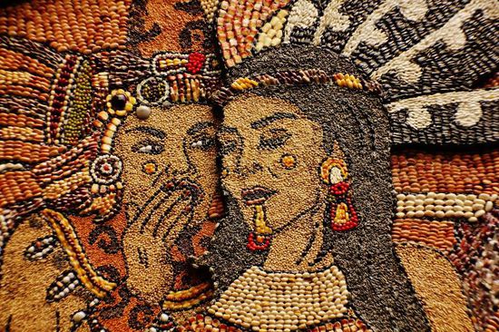 Der gewölbte Eingang zum Kloster Dominico de la Natividad ist mit einem aufwendigen Wandgemälde aus Samen und Körnern geschmückt, das Themen und Symbole der vorspanischen Geschichte darstellt...