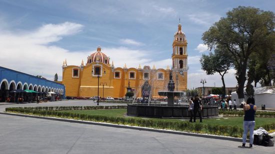In Cholula besichtigen wir die vom Volumen her weltgroesste Pyramide, zwar nur 60m hoch, doch mit 350m Kantenlänge mächtiger als die Cheopspyramide bei Kairo. In über 800 Jahren über Tempel im Innern erstellt und durchlöchert wie ein Schweizer Käse. Archäologen haben im Laufe der Zeit über 4km lange, derartige Gänge durch die Pyramide gegraben,