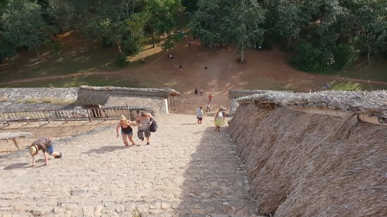 Auf dem Weg, setzt bei Anja ein Unwohlsein ein und sie wird von Montezumas Rache heimgesucht. Zum Glück ist die Ruine so klein und Anja schleppt sich durch… Irgendwie passend, wandelt sie grün angelaufen, torkelnd, schweißgebadet und gelegentlich übergebend wie eine Mayamumie übers Gelände.