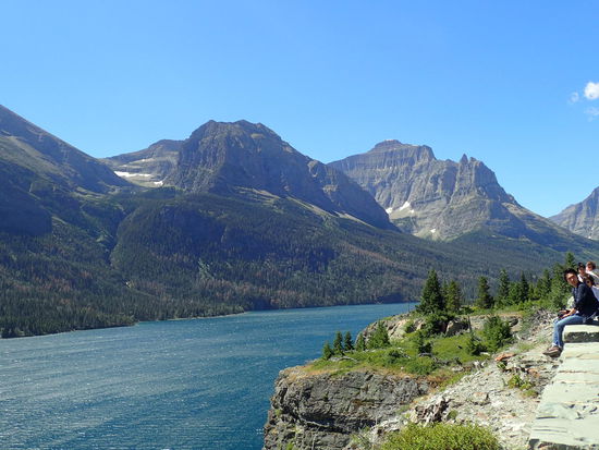 Gegen 9.15 Uhr passieren wir die Einfahrt zum NP und wir haben Glück, dass wir so zeitig dran, da nur eine kleine Schlange steht – angeblich gibt es hier in der Saison bis zu einer Stunde Wartezeit. Unser erster Halt ist beim Besucherzentrum um uns Einblick über den NP zu holen. Danach führt die Route am Lake McDonald entlang, um einige Stopps für kleine Spaziergänge und Fotos einzulegen. Danach rauf auf den 2025m hohen Logan Pass, wo ein zweites Besucherzentrum steht und die Möglichkeit besteht zum Hidden Lake zu spazieren mit der 99% Garantie Grizzlys zu sehen – ja aber eben nur theoretisch, denn praktisch ist der Parkplatz wegen Überfüllung geschlossen, und es wird leider keine andere Parkmöglichkeit angeboten. Sehr schade, aber was soll´s, so parken wir eben 500m weiter, setzen uns auf einen großen Stein und bewundern die atemberaubende Bergwelt bei Sonnenschein und tiefblauem Himmel. Nun begleiten uns ja schon seit einiger Zeit die Kanadischen Rocky Mountains, aber dies hier ist wirklich der absolute Höhepunkt – ich kann dem Reiseführer nur zustimmen. Weiter geht es nun zum Saint Mary Lake um danach den Park zu verlassen. Für dieses Erlebnis haben wir einen Umweg von 500km in Kauf genommen, die es auf jeden Fall wert waren. Sollte jemand von euch eine USA Reise planen, bitte unbedingt herkommen. Danach wird es etwas öd, nun geht es durch die Kornkammer Montanas. Die nächsten 250km nur Getreidefelder die bereits gedroschen sind, oder in den nächsten Tagen werden. Na ja was soll´s, Korn wird auch dringend gebraucht – von den Bergen alleine wird niemand satt. Für heute Abend wurde mir ein Campingplatz mit warmen Duschen versprochen. Doch wie das Leben so spielt sehen wir etwa 5km vorher eine Abzweigung auf einen Stausee mit Campingmöglichkeit – ade warme Dusche. Schnell ist das Zelt aufgestellt und nun heißt es – Margit, ab in den See – brrr ist das kalt, max. 23° ich bin soooo arm. Nein im Ernst, es ist traumhaft bei 36° Außentemperatur im See schwimmen zu gehen. Es ist so angenehm, dass ich es gleich zwei Mal mache – dann reicht´s, übertreiben ist auch nicht gut. Unser Zelt steht etwa 40m über dem See und wir genießen diesen Blick den ganzen Abend bis die Sonne langsam untergeht.
