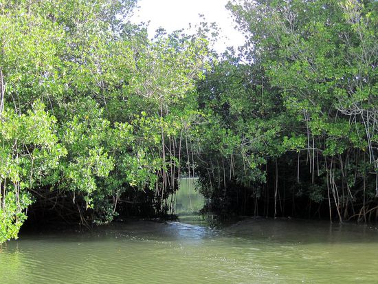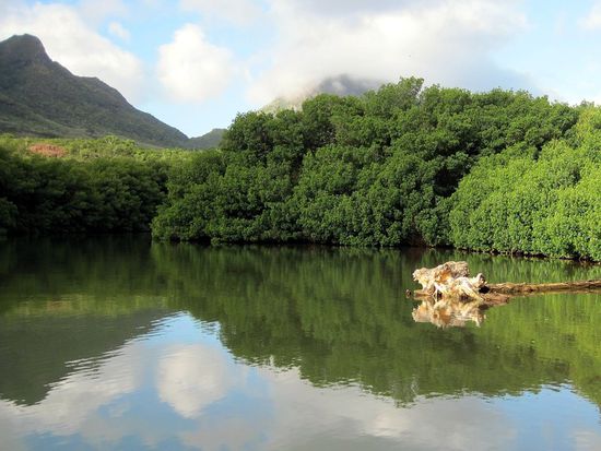 Von der Seite kommen mehrere Zuflüsse vom Menhune Fishpond. Die Menhune sind mythische Vorfahren, die schon vor der letzten polynesischen Besiedlung da waren und deren Wirken von Geheimnissen umrankt ist. Die Fishponds waren eine sehr nützliche Erfindung. Hier konnten lebende Vorräte angelegt werden für Zeiten, wo das Meer zu stürmisch zum Fischen war. Die Durchfahrten sind mir aber zu schmal. Und auch der Respekt vor den Menhune verbietet das.