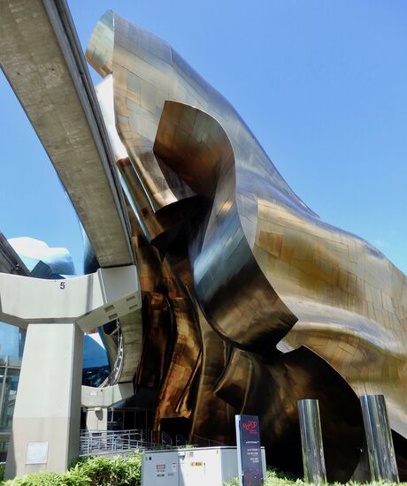 Nachdem wir genug gesehen und die Aussicht genossen hatten, machten wir einen kleinen Spaziergang rund um die Needle und die weiteren sehenswerten Gebäude. Besonders beeindruckend ist das Museum of Pop. Die Architektur ist sehr ausgefallen. Dieser Architekt (Gehry) hat auch die Disney Music-Hall in LA geplant, die wir vor einigen Jahren gesehen haben. Das Gebäude hat eine metallene Aussenhaut, die sich geschwungen erhebt.