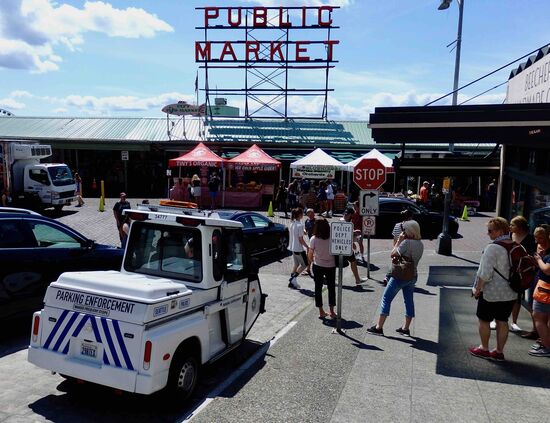 Kurze Rast auf einer Parkbank und schon ging es zum Public Market und der Waterfront. Um dort hinzugelangen spazierten wir durch Belltown, ein angesagter Szenebezirk. Ehrlich gesagt, konnten wir nichts Angesagtes entdecken, fanden die Gegend eher etwas schmutzig. Der Publikmarket ist in Markthallen, in denen frische Produkte wie Obst, Gemüse, Fisch und Meeresfrüchte angeboten werden. Dazu gibt es noch alles was das Touristenherz höher schlagen lässt und die dazu gehörige Masse an Menschen. Wir hielten uns dort nicht lange auf, sondern wanderten zum Pier an der Waterfront. Dies ist nicht so schön wie das in Santa Monica, aber auch ganz nett mit einem Riesenrad.