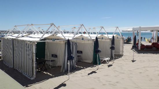 einige wenige auch im Wasser, aber das tollste hier, diese mit Tisch und Stühlen ausgestatteten Kabinen