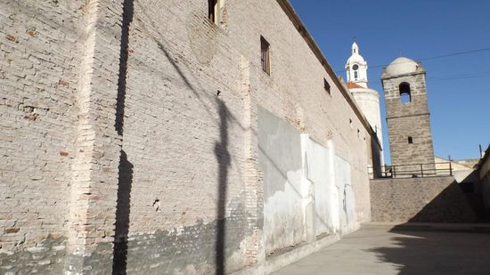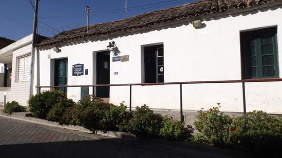 eingerahmt von zwei 1820 erbeuteten brasilianischen Kriegsflaggen, dazu ein schöner historischer Stadtkern mit alten Adobe Häusern,