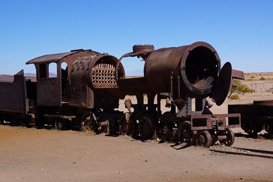 Nach dem Frühstück bringen wir unsere aussortieren Sachen in meinem Rucksackschutzbeutel zur Reiseagentur. Kurz nach zehn werden wir zum Geländewagen geführt in dem schon eine bolivianische Familie wartet. Sie macht nur einen eintägigen Ausflug und wir werden später zu den Anderen zusammen stoßen, die ebenfalls eine mehrtägige Tour machen. Wir fahren zunächst zu dem cementerio de trenes, dass sich nur etwa 2-3 km von der Stadt entfernt befindet. Es ist windig. Als wir über den Zugfriedhof laufen, versuchen wir, unsere Kameras vor dem Staub zu schützen.